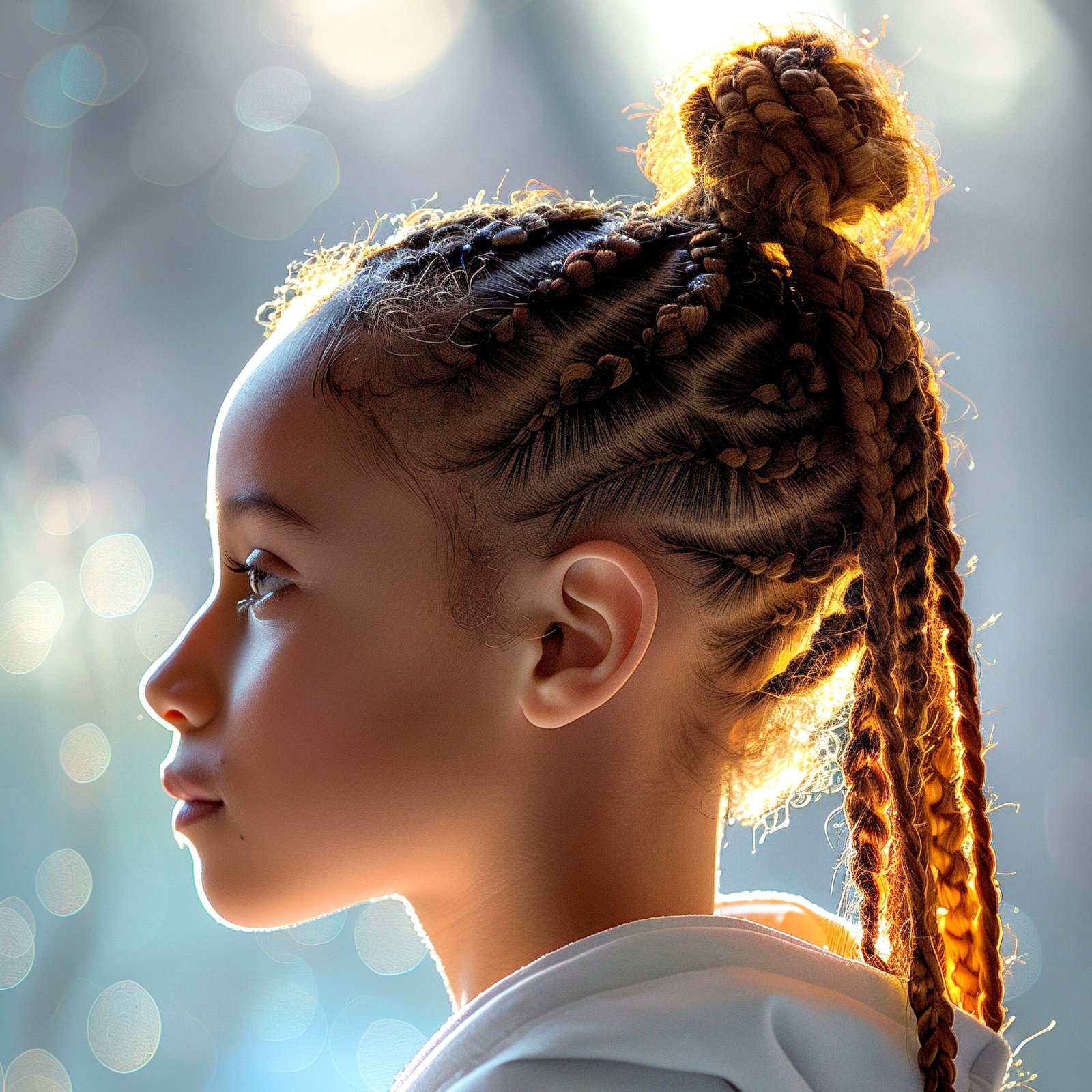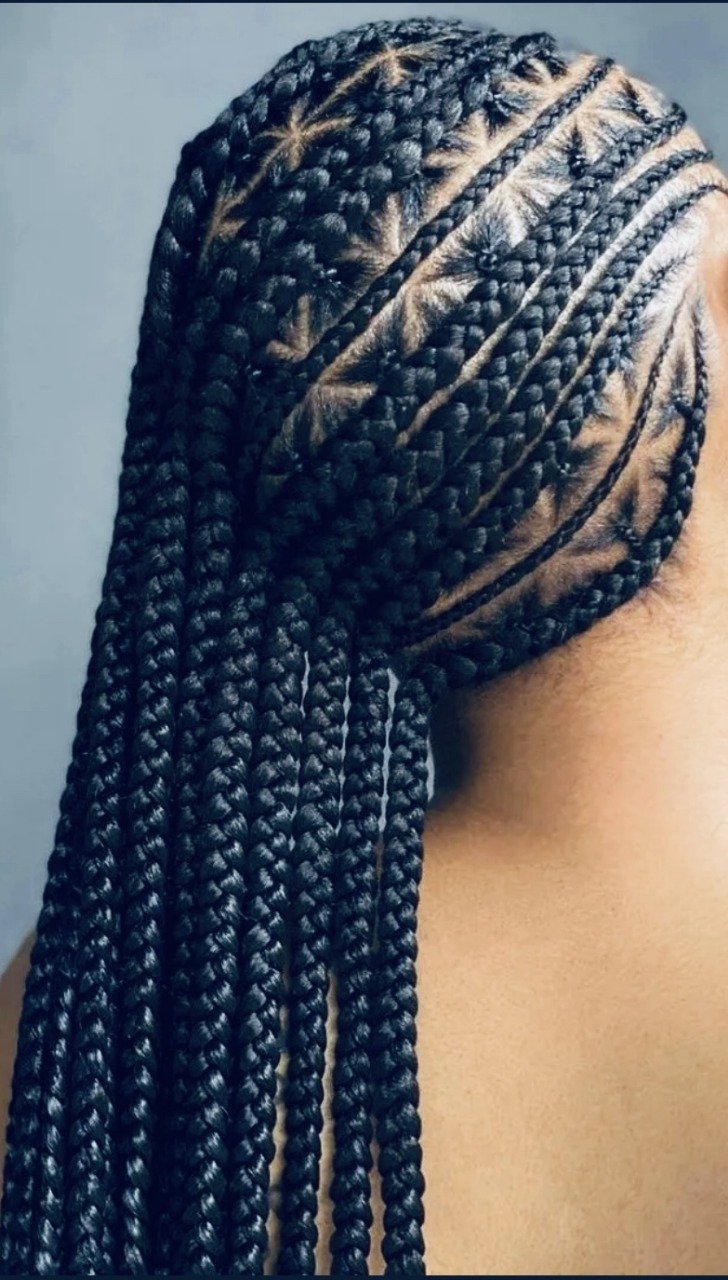 Side-swept cornrows offering a sleek, stylish, and bold braided look.